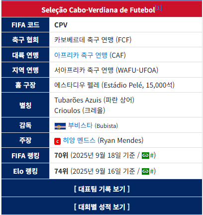 카보베르데 대표팀은 ‘푸른 상어들’이라는 별명으로 불리며, 유럽파 선수들이 중심 전력을 구성하고 있습니다.
